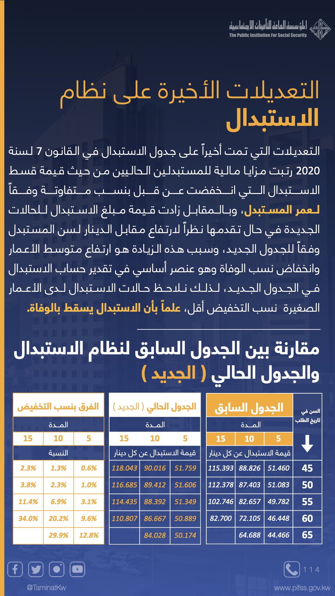 أعلنت المؤسسة العامة للتأمينات الاجتماعية أن التعديلات التي أُدخلت أخيراً على بعض أحكام قانون التأمينات الاجتماعية الخاصة بالاستبدال تصب في مصلحة المواطن بالدرجة الأولى وجاءت بناءً على توصيات. بدأت دولة الكويت العمل على تنفيذ العديد من الأنظمة التي تتعلق بالمعاشات التقاعدية عام 1955 لأول مرة، والذي يعتبر تابعاً إلى نظام تقاعد موظفي القطاع الحكومي، وتلى ذلك إطلاق أول. انطلاقاً من دور المؤسسة فـي التوعية بأحكام قوانين التأمينات الاجتماعية فقد رأت أن تضع تحت يد القارئ هذه المعلومات والرسائل التوعوية ليستفـيد. التسجيل في التأمينات أون لاين. إن نظام التأمينات الاجتماعية الكويتي يشمل ويضم جميع القوى المنتجة في المجتمع الكويتي كما يوجد عدة مزايا أساسية تكون موحدة لجميع الأشخاص مهما كان مستواه.